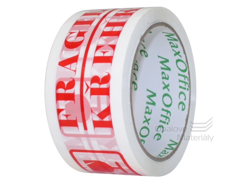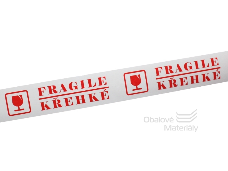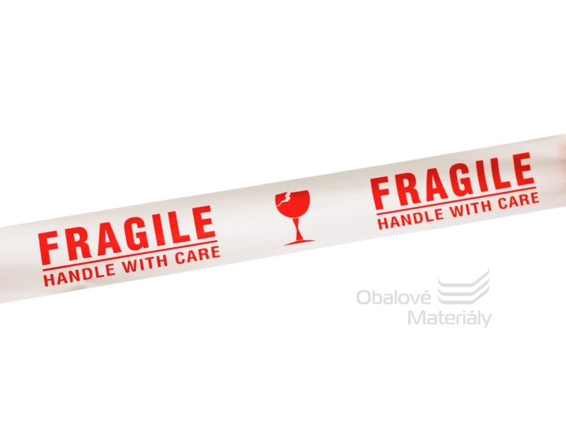 Bílá výstražná lepící páska s červeným nápisem FRAGILE, lepidlo akryl.