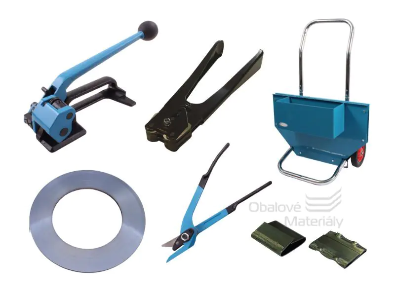 | Vázací páska ocelová, 16*0,5 mm, 25 kg | Odvíječ ocelové pásky H 95A pro pásky šíře 9-20 mm | Sada ocelové vázací pásky, napínač, kleště, spony, nůžky a odvíječ |