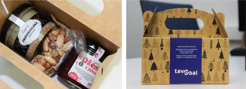 Balíček č. 1: První balíček se skládal z bílého vína z Vinařství Thaya, provensálské paštiky Čongrády a slané směsi oříšků. Výrobky byly následně zabaleny do prémiové odnosové krabičky na víno, ozdobené designovou manžetou se stromečky.