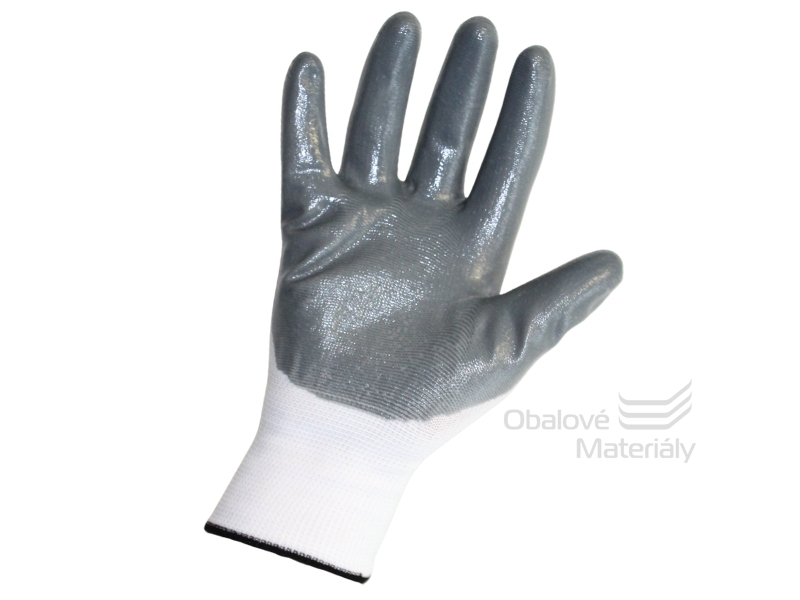 Pracovní rukavice X-Nitron z bílého polyesteru, potažené na špičkách prstů nitrilem. Vhodné pro manuální práce, velmi dobrá citlivost při držení předmětu. Roztažitelné a elastické, zakončené lemováním. Bílé rukavice splňují normu CE EN 388. Velikost 10. Barva bílá/šedá.