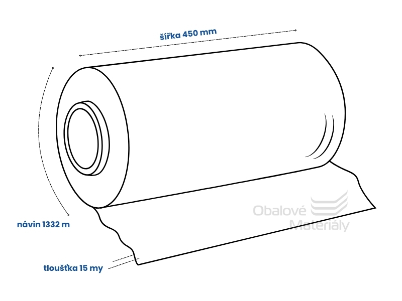 Jedná se o polohadici se šířkou 450 mm, tloušťkou 15 my a návinem 1332 m. Fólie má atest pro styk s potravinami.